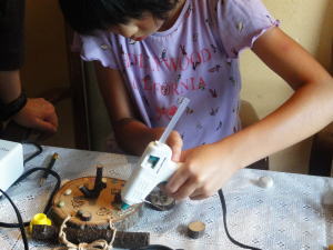 飾り板を選んだら、松ぼっくりや豆、枝や木のパーツを組み合わせてグルーガンでくっつけていくだけ!