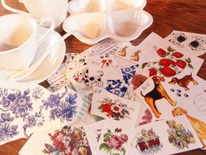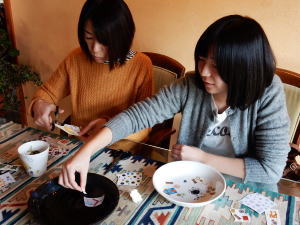 白磁器の食器に特殊な転写シールを貼って、オリジナルの食器を作るポーセリンアート。