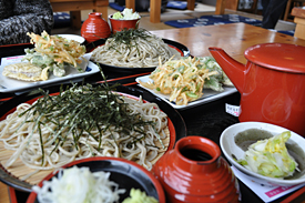 水車小屋にある直径12mと5.6mの2連水車の石臼で挽いたソバ粉を使用した手打ソバが食べられます。