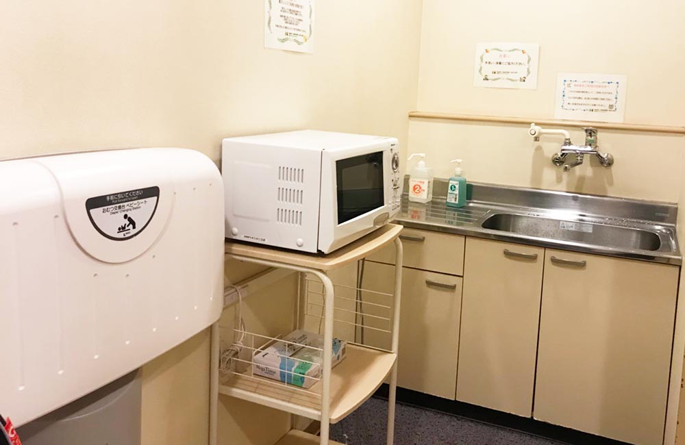 電子レンジや、食器などを洗うことができるシンクもあり、赤ちゃんや小さいお子様連れに配慮されているのがよくわかります。